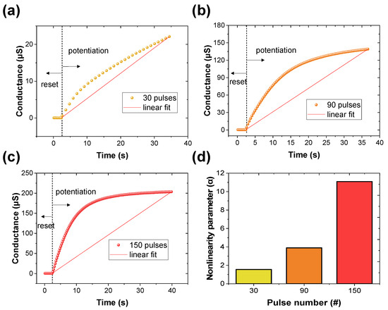 Plots of nonlinear conductance variation when (a) 30, (b) 90, (c) 150 pulses are applied. (d) Variation of nonlinearity parameter as a function of the number of pulses.