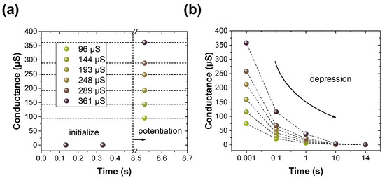 (a) Conductance modulation before and after potentiation according to voltage. (b) Modulation of depression conductance after potentiation.