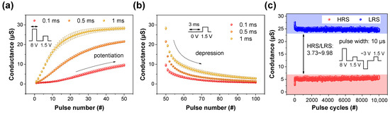 For depression, the pulse shown in Figure S4 is transmitted to the device. Like potentiation, after initialization, the conductance is intentionally varied to take values in the range of 100–350 μS, as shown in Figure 6a. Herein, it is only read to suppress dramatic changes, utilizing short-term memory characteristics that are gradually forgotten over time. All the conductance noticeably decreases from 100 ms and become negligibly small after 1 ms. During the period from 10 s to 14 s, these conductance values nearly return to the initial state. Based on this, the decreased conductance can be defined by modulating the interval time between read pulses. The cells are randomly selected and averaged for both potentiation (Figure 7a) and depression (Figure 7b). Unlike the previous approach, the impact of pulse width was investigated. As observed in Figure 7a, an expansion in pulse width corresponds to an increase in both nonlinearity and conductance. This suggests that the pulse width amplifies the change required to reach the next level. A larger conductance demands a longer depression time, as explicitly indicated in Figure 7b. Finally, Figure 7c shows the endurance response of Pt/BN/TiN RRAM devices at the HRS and LRS states after the repetitive application of pulse trains comprising 8 V, 1.5 V, −3 V, and 1.5 V with pulse widths of 10 μs. Throughout the period spanning 10,000 cycles, the HRS and LRS are maintained at values equal to or greater than 3.73. The summary of different types of BN and their applications in inorganic materials is provided in Table 1 [47,48,49,50,51].