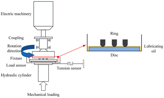 The MDW-5G friction and wear test machine adopts a disc configuration for tribological experiments. The friction specimens are fixed onto the freely rotating test table through holes, and temperature, friction force, and friction coefficient are measured in real time using force and temperature sensors installed on the test table. The counterpart specimens are fixed onto a fixture mounted on the spindle using screw holes and side holes. The test machine’s hydraulic system applies the load. The schematic diagram of the experimental setup is shown in Figure 3.
