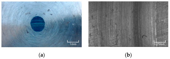 Since it is not possible to simulate friction and wear tests under grease lubrication conditions, the selection of specific test parameters requires preliminary preparatory tests. For the 42CrMo4 sample with a hardness of 52 , the following parameters were chosen: a rotational speed of 100 , a load of 600 , a wear time of 6 , and a total test revolution of 36,000 . The specimen after the experiment is shown in Figure 4.