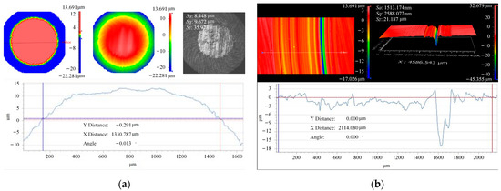 Based on the three-dimensional wear topography under the condition of 44 hardness, it can be observed that the maximum depth of the wear track reaches 20 . The wear is more severe in the middle region, while the depths of the wear tracks on the sides are less than 10 . Combined with Figure 18a, under lower hardness conditions, the primary wear mechanism is plowing accompanied by adhesive wear. Under the condition of 60 hardness, the maximum depth of the wear track is only 4 . Under higher hardness matching, the friction pair of 42CrMo4/17NiCrMo6-4 exhibits significantly lower and wear volume compared with the specimens with lower hardness matching, indicating that higher hardness is advantageous in reducing wear. This is because as hardness increases, the material’s ability to resist external indentation and scratching is enhanced, leading to improved wear resistance and a reduction in wear volume.