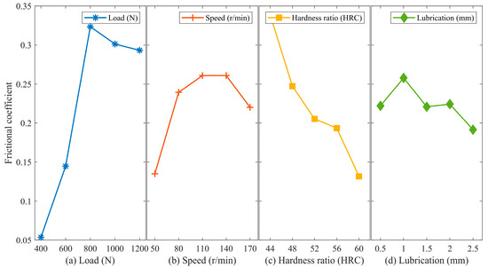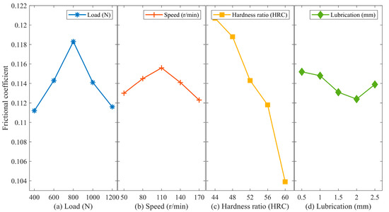 Main effect analysis of friction coefficient. (a) Load; (b) Speed; (c) Hardness ratio; (d) Lubrication.