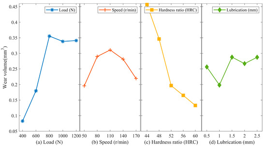 Main effect analysis of 17NiCrMo6-4 wear volume. (a) Load; (b) Speed; (c) Hardness ratio; (d) Lubrication.