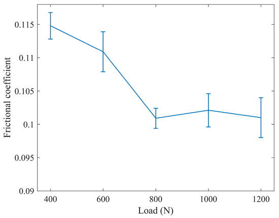 As shown in Figure 9, when the load is less than 800 , the friction coefficient decreases with increasing load, and the decrease is relatively significant. When the load exceeds 800 , the friction coefficient remains stable with increasing load, indicating that the friction coefficient is more sensitive to load variations at lower loads. When the load exceeds 800 , the average friction coefficient stabilizes at around 0.101, indicating that it is beneficial to reduce the friction coefficient under higher loads.