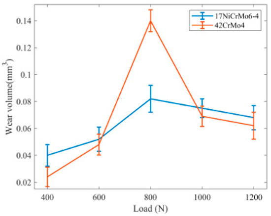 As shown in Figure 10, with an increase in load, the volume of wear exhibits a trend of initially increasing and then decreasing. The 17NiCrMo6-4 material shows a relatively stable trend, with the volume of wear maintained between 0.04~0.08 . On the other hand, 42CrMo4 shows a greater variation, with the volume of wear ranging from 0.02 to 0.11 .