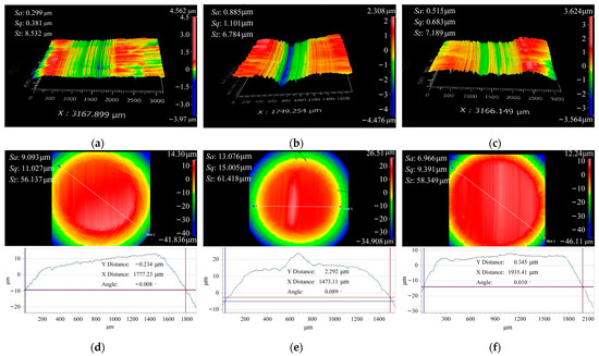 Surface topography under different loads. (a) 42CrMo4 under 400 ; (b) 42CrMo4 under 800 ; (c) 42CrMo4 under 1200 ; (d) 17NiCrMo6-4 under 400 ; (e) 17NiCrMo6-4 under 800 ; (f) 17NiCrMo6-4 under 1200 .