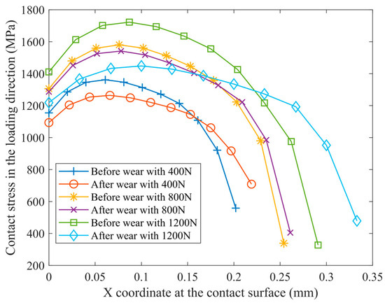 Stress in the loading direction along the contact interface before and after wear.