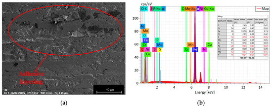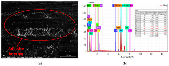 Figure 15. Wear morphologies and EDS diagrams of 17NiCrMo6-4 at applied loads of 800 N. (a) the wear morphologies of 17NiCrMo6-4; (b) EDS diagrams of 17NiCrMo6-4. - Based on the three-dimensional topography (Figure 11c) and microtopography images (Figure 13e,f) under a 1200 N load, it can be observed that the predominant wear types on 42CrMo4 are abrasive wear and adhesive delamination [31], while 17NiCrMo6-4 exhibits primarily plastic flow and adhesive delamination. Even after ultrasonic cleaning, a layered structure is still visible. This is attributable to the excessively high load, which generates a significant amount of wear debris in the early stage of wear. Some of the debris escapes the frictional system, while the remaining debris undergoes repeated compaction on the material surface under high loads. The high shear stress induces severe plastic deformation between the specimens, resulting in welding phenomena. The surface hardness is further increased due to the work-hardening effect. The presence of an adhesive layer on the specimen surface hinders the initiation of new wear, providing better protection for the underlying substrate. As a result, the wear volume decreases with increasing load.