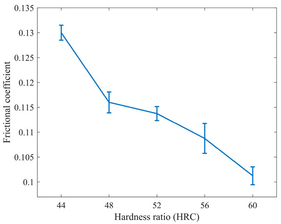 As shown in Figure 16, the average friction coefficient decreases with increasing surface hardness. The trend of change is more significant in the initial stage, relatively moderate in the middle section, and becomes prominent again when the hardness exceeds 56 . This indicates that the increase in hardness has a more pronounced effect on reducing the friction coefficient in the early and later stages.