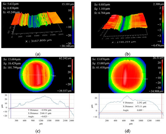 Surface topography under different loads. (a) 42CrMo4 with 44–60 HRC; (b) 42CrMo4 with 60–60 HRC; (c) 17NiCrMo6-4 with 44–60 HRC; (d) 17NiCrMo6-4 with 60–60 HRC.
