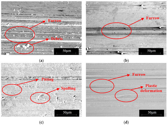 Surface microstructures under different hardness matches, as captured by scanning electron microscopy (SEM), are shown in Figure 19. It can be observed that when 42CrMo4 has a hardness of 44 , the wear tracks are deeper, and the presence of wear debris can be seen on both 42CrMo4/17NiCrMo6-4. This type of wear debris is caused by micro-cutting action. When the attack angle of the third body between the friction pair exceeds a certain value, it transitions from plowing to cutting action. As the attack angle decreases, the cutting effect disappears [33,34]. Therefore, wear debris can be observed on the worn surface, and it cannot be easily removed by ultrasonic cleaning. Moreover, there is also significant abrasive wear on 17NiCrMo6-4. The results indicate that under conditions where there is a significant difference in hardness between the friction pair, micro-plowing, and micro-cutting are more likely to occur, leading to an increased friction coefficient and wear volume.