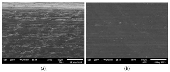 In the case of wire rolling, the wire profile is created by flattening the wire and rolling it until the final shape is achieved using so-called “Turkish cages” []. The greatest advantage of cold rolling is the ability to produce a product with precise dimensions and excellent surface quality. The surface is smooth, free of scale, shiny, and without scratches or stains. The material is cold-rolled, which prevents recrystallization processes that would negatively affect the physical properties of the resulting product. Work hardening increases the hardness and tensile strength of the produced profiles, resulting in high operational properties. Their load-bearing capacity increases, as does fatigue strength and wear resistance. Among the other requirements placed on materials for slotted screens are corrosion resistance and high surface quality []. The surface roughness and corrosion resistance of these semi-finished products are crucial during the production of slotted screens.