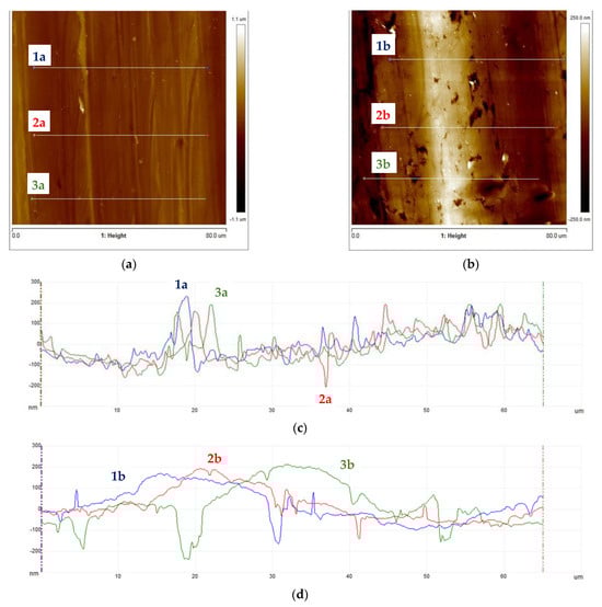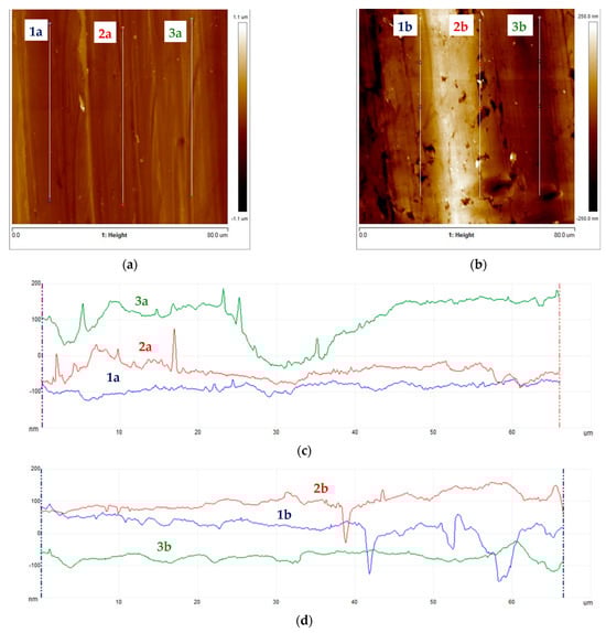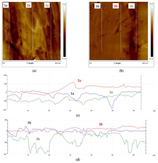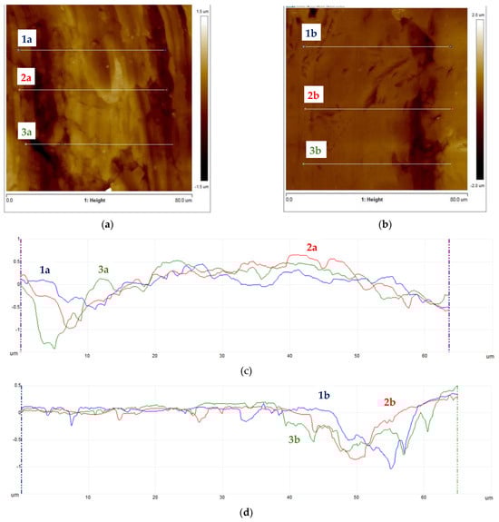 Subsequently, samples were subjected to micro-area roughness measurements marked with an asterisk in Figure 2 using a Brucker Multimode 8 atomic force microscope. The results of the measurements are presented in Figure 11, Figure 12, Figure 13 and Figure 14 and in Table 3.