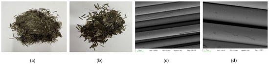 Macroscopic and microscopic diagrams of basalt fiber morphology; (a) 16 μm Basalt fiber; (b) 25 μm Basalt fiber; (c) Microscopic diagrams of 16 μm basalt fiber; (d) Microscopic diagrams of 25 μm basalt fiber.