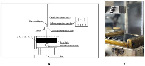 Fiber pullout test: (a) Schematic diagram of a monofilament-asphalt pullout device; (b) Actual test diagram.