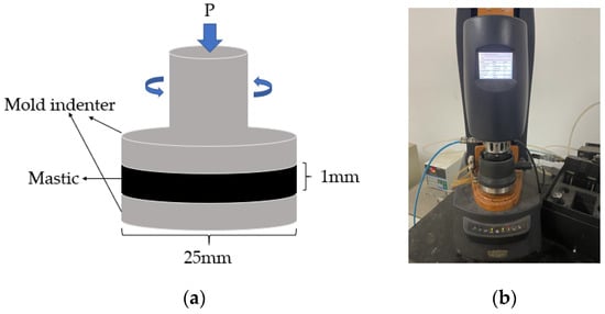 The DSR temperature sweep test was conducted using the dynamic shear rheometer from TA Instruments according to the AASHTO T 315-12 specification [34], as shown in Figure 4 with the temperature set to 52 °C~82 °C. The fiber asphalt mastic was injected into an elastic rubber mold with a diameter of 25 mm and a thickness of 2 mm. After the sample was cooled, it was removed and set on the fixture, the excess material was tripped off, and the test data were collected at intervals of every 6 °C. The final data were the average value of three duplicates.