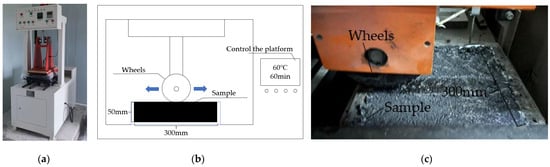 The mixture was formed into a cube specimen with dimensions of 300 × 300 × 50 mm by the rutting plate roller described in detail in JTG E20-2011 [31]. After the specimen was formed, it was first put into the experimental cabin for heat preservation, and the experiment was carried out after the specimen reached 60 °C, as shown in Figure 7. The rutting resistance of asphalt mixtures is assessed using the dynamic stability index, calculated by Equation (11).