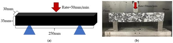 The fiber asphalt mixture was made into a 30 × 35 × 250 mm prismatic beam specimen and tested after 2 h of insulation at −10 °C, as shown in Figure 9. Then, it was determined what the bending stiffness modulus SB, maximum bending strain , and bending tensile strength RB were. Equations (14)–(16) display the calculating formula.