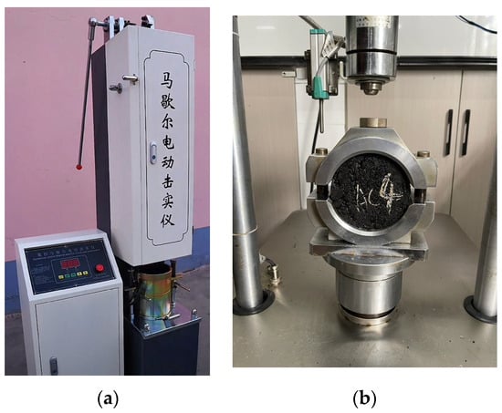 Cylindrical asphalt mixture specimens fabricated by gyratory compaction were closer to those compacted in the field by a roller compactor [37]. Since the water-immersion Marshall test was conducted according to the specification of JTG E20-2011, the cylindrical specimen with a diameter of 101.6 mm and height of 63.5 mm was fabricated by the Marshall compactor, as shown in Figure 10. The specimens for the water immersion Marshall test were divided into two batches and immersed entirely in water at 60 °C; one batch was removed for the stability test after two hours, while the other batch was removed and tested after 48 h. The stability was expressed by Equation (17).