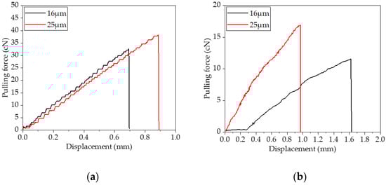 At 25 °C, the tensile force of two fibers with different diameters gradually increased with the increase in tensile displacement in the stretching process. The interface damage between them and asphalt mastic eventually displayed a violent fracture, showing that the fiber fracture mode was still present. As shown in Figure 11b, the displacement of the 16 μm basalt fiber when it was pulled off was close to 1.6 mm at the breaking point, which was greater than 0.97 mm of the 25 μm fiber. Because at 25 °C, asphalt mastic presented a viscoelastic state, the restraining effect on the fiber was smaller than that at −12 °C. Due to the large contact area between basalt fiber monofilament with a diameter of 25 μm and asphalt mastic, the adhesion area between asphalt mastic and the fiber was large [11]. Therefore, more pulling force was needed to make the same displacement; basalt fiber with a diameter of 25 μm had a much higher maximum pulling force than basalt fiber with a diameter of 16 μm.