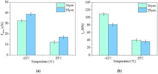 Figure 12a shows that the pulling force Fmax of both fibers was higher at −12 °C than at 25 °C, and the fiber’s fracture strength parameters were in line with its size. The pulling force of 25 μm fiber in asphalt mastic was larger than that of 16 μm fiber at the same temperature. Figure 12b demonstrates that, nevertheless, the adhesion strength between fiber and asphalt mastic increases with the decreasing diameter of the fiber. At −12 °C, the interfacial adhesion strength of 16 μm basalt fibers increased by 34.18% compared to 25 μm fibers, and at 25 °C, this value increased only by 11.01%. This was due to the different diameters of fiber, and its cohesion area with the asphalt was also different. From Equation (2), it can be seen that in the case of Fmax, it was not much different; the larger the S, the smaller the interface adhesion strength.