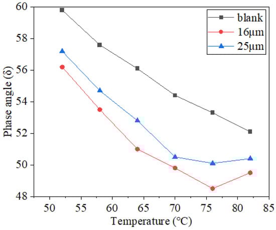 As shown in Figure 13, as the temperature increases, the phase angle generally indicates a downward trend, and the overall change is significant. The experimental findings demonstrated that as the temperature rose, the viscosity of asphalt mastic decreased while the elasticity component decreased [16]. At the same temperature, the phase angle of basalt fiber asphalt mastic was smaller than that of asphalt mastic without fiber. Compared to the asphalt mastic, the phase angle of the fiber asphalt mastic dropped by 4.8° and 3.2°, respectively, after adding 16 µm and 25 µm basalt fiber, according to the phase angle data at 76 °C. Because the fibers are covered with one another to shape a “bracket” and assumed to be part of a “network” in the asphalt mastic [38,39], a structural asphalt interfacial layer with a strong adhesion force formed on the fiber’s surface after the asphalt made contact with it, improving the bonding performance of asphalt while also limiting the mastic’s ability to deform around the fiber and lowering its fluidity [20]. Larger specific surface area fibers can absorb more asphalt and exhibit greater elastic properties. At the same weight content, 16 μm basalt fiber had more monofilaments and specific surface area than 25 μm, resulting in improved elastic characteristics in asphalt mastic, which is in accordance with the findings in reference [20].