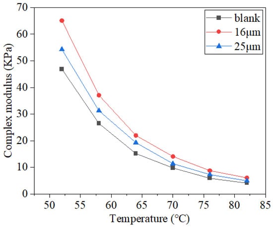 Complex modulus test results are shown in Figure 14. As the temperature rose, the complex modulus decreased [20]. This was mainly due to the deformation and thermal effect of asphalt molecules under loading, and the motility of asphalt molecules was enhanced. Deformation was more likely to occur, which was manifested by the decrease in modulus. Results showed that its resistance to deformation when subjected to traffic loads and temperature changes was constantly weakened. Asphalt mastic with two fibers of different diameters had a larger complex modulus than that of the blank asphalt mastic at the same temperature. Following the addition of 16 µm and 25 µm basalt fibers, the complex modulus of mastic increased by 49.15% and 23.73%, respectively, when the testing temperature reached 76 °C. These outcomes demonstrated that fibers might be added to the SBS-modified asphalt to increase its deformation resistance further [32]. The complex modulus of 25 µm basalt fiber asphalt mastic was smaller than that of 16 µm fiber, indicating that 16 µm mastic presented stronger resistance to deformation, which is consistent with the research results of the references [40,41].