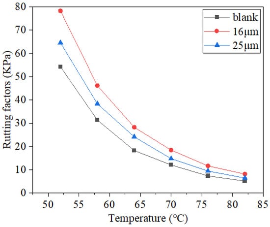 As the temperature rose, the rutting factor values of all three asphalt mastics decreased, indicating that the high-temperature environment weakened its resistance to rutting (Figure 15). At the same temperature, blank asphalt mastic had a lower rutting factor than the other two asphalt mastics with different diameter fibers. Taking the rutting factor data at 76 °C as an example, after adding 16 μm and 25 μm basalt fibers, the rutting factor values of fiber asphalt mastic increased by 58.11% and 28.38%, respectively. The outcomes demonstrated that fiber addition could enhance rutting resistance at high temperatures. At the same temperature, the rutting factor of 16 μm basalt fiber asphalt mastic was greater than that of 25 μm fiber, indicating smaller fiber diameter guarantees greater resistance to rutting at high temperatures.