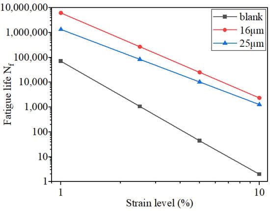 The fatigue performance of asphalt was assessed using the linear amplitude sweep (LAS) technique following the AASHTO TP 101-12 guidelines [35]. The test uses three strain levels of 2.5%, 5.0%, and 10% at a temperature of 25 °C as shown in Figure 5. The diameter of the mold indenter is 8 mm, and the gap is 2 mm. The fatigue life Nf was calculated in Equation (5), and the coefficients A35 and B were calculated by Equations (6) and (7). The final data were averaged across three samples.
