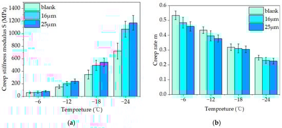 The low-temperature characteristics of fiber-modified asphalt were investigated using a TE-BBR-F type bending beam rheometer according to the AASHTO TP 125-16 specification [36]. The test plot is shown in Figure 6. The test temperatures are from −6 °C to −24 °C, setting 6 °C as the interval. The sample was poured into a stainless-steel mold of 125 × 12.5 × 6.25 mm, and a water bath in ethanol was placed to maintain the experimental temperature before testing. The creep stiffness (S) and creep rate (m) of the beam sample were used to assess the fiber mastic’s low-temperature performance. Formulas (8)–(10) display the calculation mechanism for m and S.