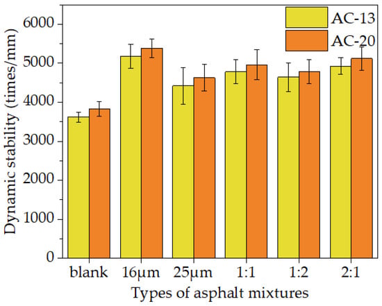 It can be seen from Figure 18 that, compared to the blank mixture, asphalt mixtures with 16 μm and 25 μm basalt fiber had dynamic stability of 43.00% and 22.26% higher for the AC-13 gradation. In addition, the dynamic stability of the mixture rose by 32.30%, 28.35%, and 36.28% when the mixing scheme (16 μm: 25 μm) was 1:1, 1:2, and 2:1, respectively. The dynamic stability enhancement trend of the fiber-modified AC-20 mixture was comparable to that in the AC-13 gradation. The dynamic stability of the corresponding fiber asphalt mixture increased by 40.64%, 20.88%, 29.55%, 24.98%, and 33.62% over the blank sample. This was attributed to the fact that the viscosity of the asphalt mixture might be improved by basalt fibers’ ability to absorb some of the free asphalt and inhibit the flow ability of asphalt, as reflected in the DSR test results in Section 2.3.2. High-temperature stability can be improved by adding fibers to asphalt mastic, enhancing the properties of the asphalt mixture. The fibers in the mixture were equally dispersed and created a three-dimensional network structure simultaneously [45]. This construction could better reinforce the aggregate skeleton and strengthen the mixture. Thus, the rutting resistance performance of the mixture was improved.