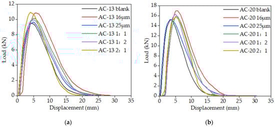 IDEAL-CT test load-displacement curve of asphalt mixture: (a): AC-13; (b): AC-20.
