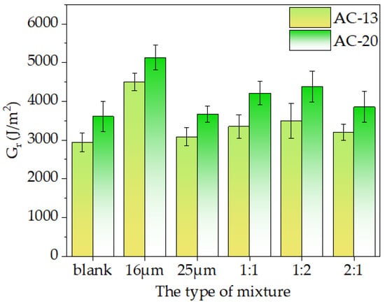 It can be seen from Figure 20 that the crack resistance of the asphalt mixture with basalt fiber was significantly higher than that of the blank asphalt mixture. The crack initiation energy (Gr) of a single-doped asphalt mixture with a diameter of 16 μm or 25 μm increased by 52.97% and 4.94%, respectively, compared to the blank mixture of AC-13, while the Gr values increased by 13.89%, 18.82%, and 8.61% when the compounding scheme (16 μm: 25 μm) was 1:1, 1:2, and 2:1, respectively. In addition, the rupture energy (Gr) of the AC-20 followed the same change law as the AC-13 mixture. The strength and anti-crack ability of the asphalt mixture were improved by weaving a large number of basalt fibers into a three-dimensional grid structure [11]. When the mixture starts cracking, the fiber might effectively stop the crack from spreading and help the asphalt mixture withstand crack germination. This was consistent with Wu’s findings [11].