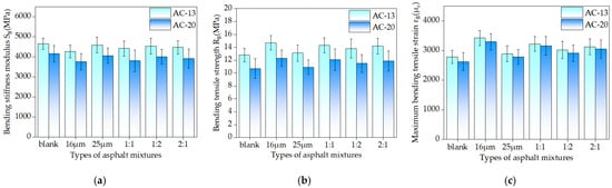 As can be seen in Figure 22a–c, the addition of basalt fiber increased the bending tensile strength and maximum bending tensile strain of the mixture of the two gradations while decreasing the bending stiffness modulus. It demonstrates how the inclusion of basalt fiber could boost the flexibility of the asphalt mixture, acting as a strengthening agent and enhancing the endurance of the asphalt mixture to crack at low temperatures. The fibers were woven into the mixture and were able to adhere to the asphalt, which served to toughen the fibers. This toughening effect successfully avoided the formation of cracks, consumed some of the stress concentration, and increased the resistance of material to cracks at low temperatures [30]. Figure 22b shows that the maximum bending strain of the single-doped 16 μm or 25 μm basalt fiber asphalt mixtures was raised by 23.07% and 3.81%, respectively, in comparison to the blank AC-13 asphalt mixture. The maximum bending strain increased by 15.63%, 8.55%, and 12.25% when the asphalt mixture with a fiber ratio of 1:1, 1:2, and 2:1 was mixed. The maximum bending strain of asphalt mixtures with single-doped 16 μm and 25 μm basalt fibers increased by 25.67% and 6.37%, respectively, compared to those without fibers in the AC-20 asphalt mixtures. The maximum bending strain increased by 20.67%, 11.10%, and 16.25%, respectively, when the mixing ratio was 1:1, 1:2, and 2:1.