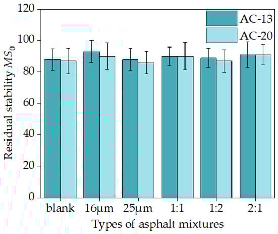 where MS0 is the residual stability of the specimen, (%); MS1 is the Marshall stability of the specimen after 48 h of water bath, (kN); MS is the Marshall stability after 2 h of water bathing (kN).