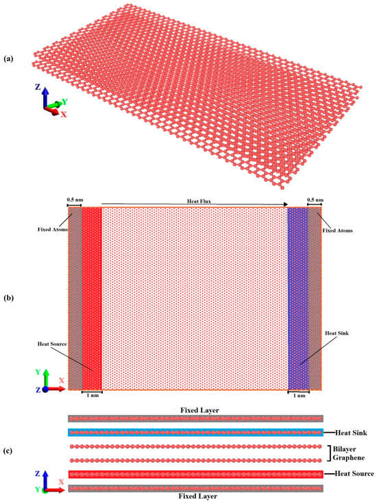 The schematic diagram of BLG is shown in Figure 1a. This figure illustrates the hexagonal structure of zigzag BLG, depicting the relative position of the two layers. Figure 1b illustrates the simulation model for the NEMD simulations of the kip. The simulation domain comprises three regions: the main simulation region, reservoir regions, and fixed walls. Two fixed walls made up of fixed atoms are positioned at the model’s ends in order to prevent atom escape from the system and limit relative sliding motion between graphene layers. Next to these fixed walls, cold and hot reservoirs (heat sink and heat source) are established to create a temperature gradient. Once the simulation structure reaches an equilibrium state, the atom velocities in the reservoir regions are artificially modified to provide a constant heat flux into the main simulation region, situated between the heat source and heat sink. During each time step, the particle velocities within the heat source and heat sink are uniformly scaled, ensuring that a uniform quantity of kinetic energy is consistently added to or deducted from both reservoirs. This process provides a constant heat flux within the simulation domain, establishing a temperature gradient aligned with the direction of heat flow. From the calculated temperature gradient and heat flow, the thermal conductivity of the graphene can be then determined from the Fourier law. To assess the localized temperatures, the model is segmented into 25 equal divisions along the X-axis direction.
