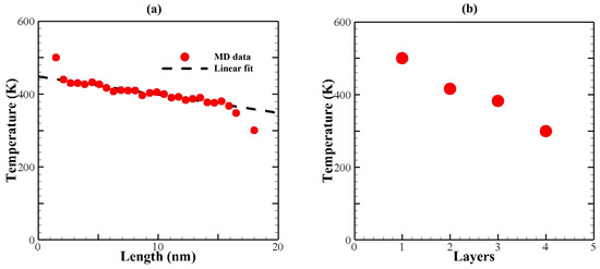 A typical temperature profile of the BLG for the in-plane conduction calculations is depicted in Figure 2a. The temperature gradient was determined using the linear region of this profile. Notably, a temperature jump is observed at the two boundaries. This temperature jump near the heat baths can be attributed to the presence of localized edge modes of phonons [45,46].