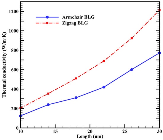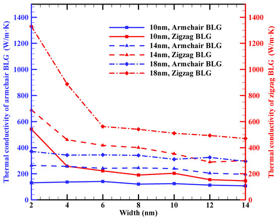 In addition, Figure 4 reveals that the width of armchair BLG sheets does not exhibit any noticeable effect on their thermal conductivity. These findings are ascribed to the influence of periodic boundary conditions in the simulation, consistent with prior research studies [55].