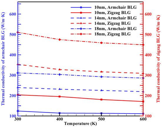 Figure 5 presents the effect of temperature variation on the thermal conductivity of zigzag and armchair BLG, covering the temperature range from 300 to 600 K for three different BLG lengths. As it has been proved that MD simulations are not well-suited for accurately predicting the thermal conductivity of graphene with temperature below 300 K [38,56], we focus on temperatures above this threshold. Based on this figure, the thermal conductivity of BLG decreases with increasing temperature, showing a slightly different rate for armchair and zigzag configurations. For a 10 nm× 10 nm sample, the thermal conductivity of the zigzag configuration drops from 203.6 W/m·K to 170.8 W/m·K as the temperature rises from 300 K to 600 K, while for the armchair configuration, it decreases from 124.3 W/m·K to 111.1 W/m·K. The behavior of thermal conductivity for BLG follows a pattern similar to that of bulk dielectric material, decreasing as the temperature rises beyond room temperature. This temperature dependence at high temperatures is attributed to umklapp phonon–phonon scattering. Experimental studies have also addressed the effect of temperature on the thermal conductivity of BLG, with results confirming that BLG’s thermal conductivity decreases as the temperature rises from 300 to 600 K [57,58].