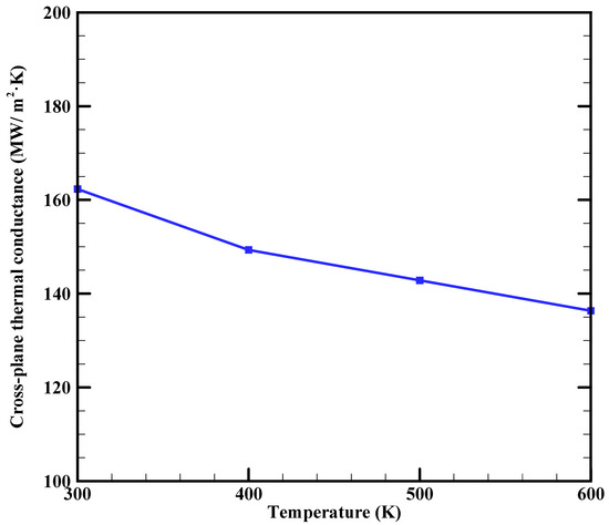 Furthermore, Figure 7 demonstrates that the cross-plane thermal conductance of BLG decreases with rising temperatures in the range of 300 to 600 K. This trend suggests that temperature impacts the cross-plane thermal conductance similarly to the kip, which monotonically decreases with increasing temperature. This observation aligns qualitatively with prior research on the temperature effect on cross-plane heat transfer in few-layered graphene [63,66,67]. The underlying physics behind this phenomenon lies in the dominance of phonon scattering in graphene heat transfer. Consequently, heat transfer should decrease as the temperature rises, independent of the direction of heat transport. In addition, it is evident from Figure 7 that the temperature-induced reduction is not particularly pronounced: the thermal conductance at 600 K is approximately 16% of that at 300 K, consistent with the behavior reported for 5-layer graphene, where cross-plane resistance was found to be almost unaffected by temperature [64].