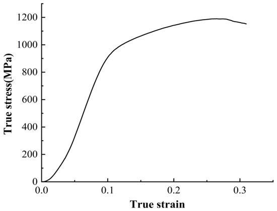 The true stress–strain curve obtained from the quasi-static compression tests of the γ-TiAl alloy is shown in Figure 1. This curve reflects the axial compressive capability of the γ-TiAl alloy under quasi-static conditions and the variation of flow stress during different deformation stages. As shown, the material’s yield stage is not prominent. The stress in the plastic deformation stage increases, indicating significant strain hardening. This is because the compression process deforms and damages the lamellar structure of the material, causing distortion at the grain boundaries and hindering further slip deformation within the material. As the strain increases, the deformation resistance of the material increases.