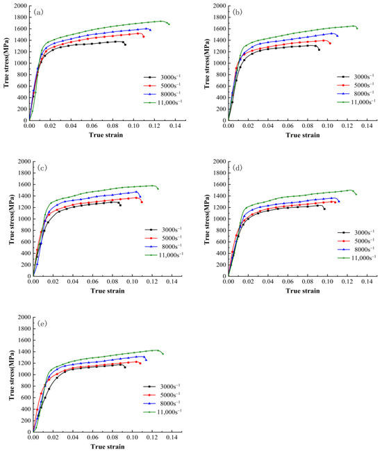 The true stress–strain curves of the γ-TiAl alloy at temperatures of 20 °C, 200 °C, 300 °C, 400 °C, and 500 °C under different strain rates are shown in Figure 2. These curves were obtained via Hopkinson pressure bar tests. As shown, during the initial stage of deformation (elastic stage), the flow stress rapidly increases with increasing strain, exhibiting work-hardening characteristics. After reaching the peak and entering the plastic stage, the flow stress continues to increase with strain but tends to stabilize and exhibits a mostly linear trend. The rapid increase in flow stress is primarily attributed to the dominant influence of strain rate strengthening, a phenomenon commonly observed in metal materials [35,36]. From Figure 2a–e, it can be seen that at all temperature ranges, both the yield stress and flow stress increase with increasing strain rate. At the same deformation temperature, the stress increases with increasing strain rate, indicating that the γ-TiAl alloy has positive strain rate sensitivity under this test condition. Under the same temperature but different strain rates, the strain hardening rate () of the material is generally similar. This trend becomes more pronounced with increasing temperature.