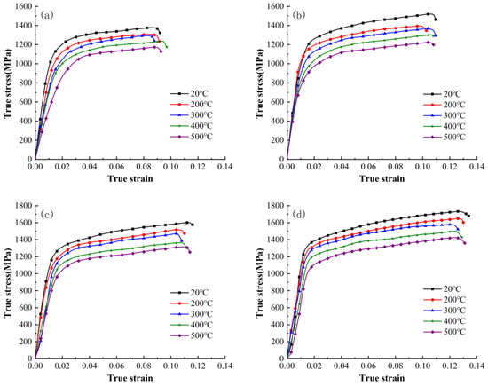 True stress–strain curves of γ-TiAl alloy under different temperatures: (a) 20 °C; (b) 200 °C; (c) 300 °C; (d) 400 °C; (e) 500 °C.
