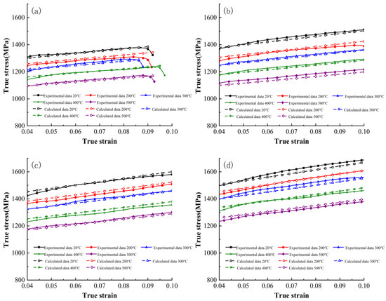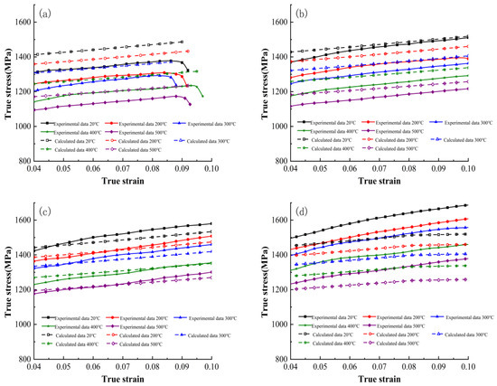 Comparison of calculated flow stress values of the improved Johnson–Cook constitutive model with experimental values: (a) 3000 s−1; (b) 5000 s−1; (c) 8000 s−1; (d) 11,000 s−1.