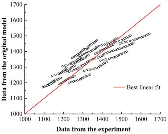 Figure 5 represents the dispersion of stress calculated using the original Johnson–Cook constitutive model compared to the experimental stress, that is, the correlation between the two sets of values. The red line in the figure represents a correlation coefficient of 1 (100%). The points above the line represents perfect agreement between the simulated and experimental values, while the points below the line indicate that the simulated values are lower than the experimental values. This figure includes data under different strain rate conditions. The calculated values of the flow stress for the γ-TiAl alloy using the original Johnson–Cook constitutive model are both higher and lower than the experimental values, with significant deviations. The correlation coefficient is only 0.838.