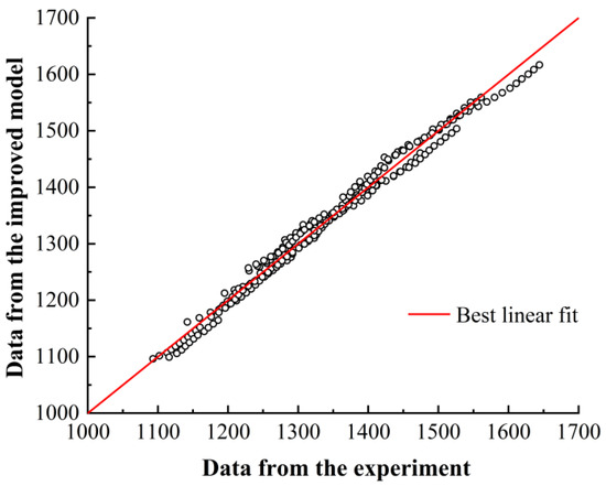 Figure 7 compares the average curve of experimental values with the fitted average curve of the improved Johnson–Cook constitutive model. It can be clearly seen that the majority of the points are close to a straight line. Compared to the original Johnson–Cook constitutive model, the improved model accurately calculates the true stress values. This is because the polynomial function for the strain rate hardening coefficient C, which considers the coupling effect of strain rate, temperature, and strain, provides a more accurate calculation of the strain rate hardening coefficient.