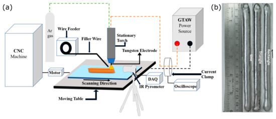 (a) Schematics of WAAM setup and (b) the deposited sections.