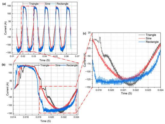 For welding and joining of aluminum-based metallic materials, alternating current (AC) is preferred as it aids in the removal of the tenacious oxide layer (cleaning action) formed on the surface [11]. Figure 2a depicts the current transients for the triangular, sinusoidal, and rectangular wave patterns. From the figure, it is evident that all the waveforms had the same wavelength and frequency. It can be seen in Figure 2b that the positive and negative half-cycles are asymmetric. This was due to the AC balance setting being set to a 40:60 ratio. This means that in a cycle, 40% of the time, the tungsten electrode will be positive and 60% time negative. This was conducted to facilitate more heat generation on the workpiece and less on the tungsten electrode. Each waveform had a peak current of 150 A during the positive half-cycle. However, for the negative half-cycle, the triangular waveform had a peak current of 150 A, the sinusoidal had a peak current of 131A, and the rectangular had a peak current of 142 A, as can be seen from Figure 2c. Also, the root mean square (RMS) current value for the rectangular waveform was 117 A, 102 A for sinusoidal, and 99 A for the triangular. This suggests that the heat input was maximum for the rectangular waveform and minimum for the triangular [23]. The corresponding voltage for each waveform can be calculated from the well-established relation [24], where is the voltage and is the current. However, the voltage was not monitored in this investigation. The rectangular waveform had the longest duration at peak current in the negative half-cycle, followed by the sinusoidal waveform and the triangular waveform (Figure 2b). This implies that the cleaning action is most prominent in the rectangular case, and more heat is generated on the workpiece than on the tungsten electrode.