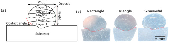 Figure 3a presents the schematic of the deposited section. For each layer, the scanning direction was kept the same. After the deposition of each layer, the welding torch was raised and repositioned to the start position for the subsequent layer deposition. The intention was to keep the time delay between the two layers to the minimum (about 30 s), thereby achieving a high interpass temperature. This high interpass temperature helps reduce porosity in the samples [25]. Though the deposited sections were of five layers, only three layers were visible as the top three layers remelted and fused together to form a single layer (Figure 3b). A similar behavior was reported by Bai et al. [26], where they found that the heat generated by GTAW was enough to remelt more than two layers. The width and height of all five-layered sections formed by different waveforms were measured, as presented in Table 3. The height was found to be maximum for the triangular and minimum for the rectangular waveform. In addition, the width was maximum for the rectangular and minimum for the triangular waveform, which is in line with their corresponding RMS current value. This behavior can be attributed to the longest duration of peak current in the negative half-cycle in the case of rectangular waveforms. Also, the height-to-width ratio for all the walls formed by different waveforms is summarized in Table 3. The five-layered wall’s height-to-width ratio was 0.97 for triangular, 0.84 for sinusoidal, and 0.76 for rectangular. This suggests that for the same wall height, the wall fabricated by the triangular waveform will have fewer layers than the other two. The contact angle was maximum for the rectangular and minimum for the sinusoidal waveform.